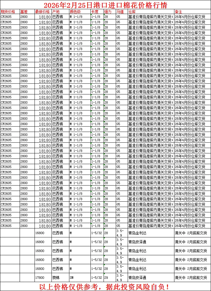 据顺风棉花网sfmianhua.com棉花大数据中心最新监测显示,2月25日港口最新进口棉花价格行情。长期追踪棉花市场价格变动,欢迎关注我们。 顺风棉花网始创于2005年8月,是国内最早从事棉花信息咨询服务的专业平台之一。二十年来,我们始终致力于为产业链企业提供涵盖籽棉、皮棉、进口棉及棉花期货的全方位信息咨询服务,已成为业内信赖的专业信息机构。依托深厚的行业数据积淀与持续的研究,我们为棉纺企业提供精准、及时的《美棉每日报告》与《郑棉每日报告》,助力企业进行基差点价、期货套保、场外期权及生产经营决策,有效应对市场波动。