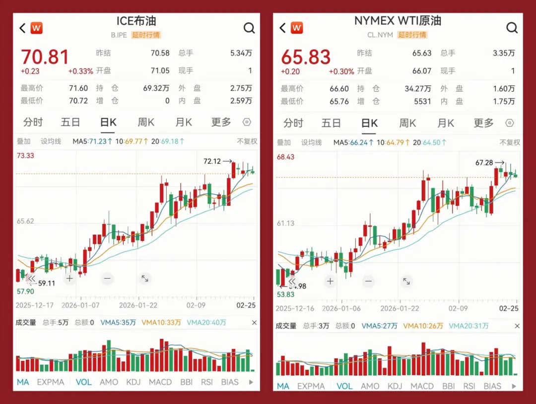 春节期间国际油价的强势反弹,节后油价依然保持强势,数据显示,截至2月25日布伦特原油期货站稳70美元/桶关口,WTI原油期货也升至65美元/桶上方,两者均创下半年多来新高,而上海原油期货主力合约在经历上个交易日大涨6.18%后,小幅回调再冲高。