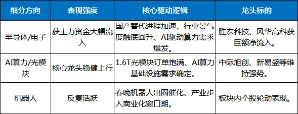 科技主线内部“软硬分化”加剧,资金向半导体、电子、AI算力硬件等有业绩支撑的方向集中。