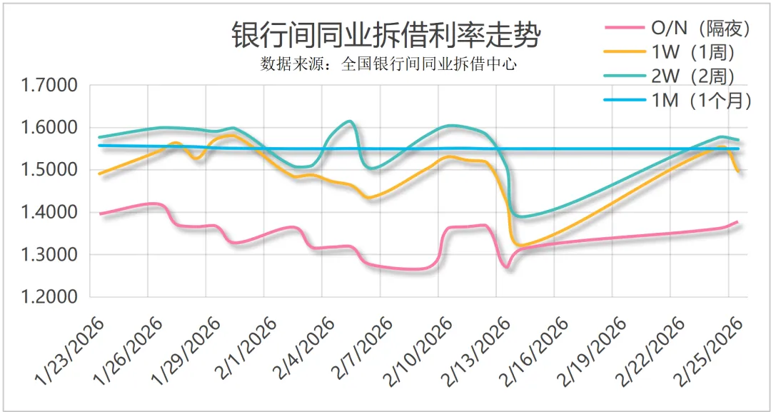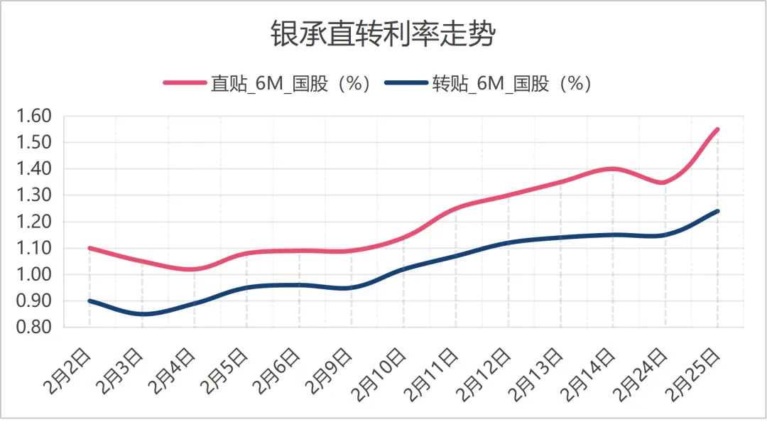 临近月末,资金面操作与票据市场走势再度形成联动。今日市场交投节奏偏快,利率重心有所抬升,贴现端与转贴端均呈现上行特征,结构性分化依旧明显。2月25日,为保持银行体系流动性充裕,人民银行以固定利率、数量招标方式开展4095亿元7天逆回购操作,中标利率维持在1.40%。同时,央行开展6000亿元MLF操作。由于当日有4000亿元14天期逆回购、1500亿元国库现金定存及3000亿元MLF到期,公开市场实现净投放1595亿元。