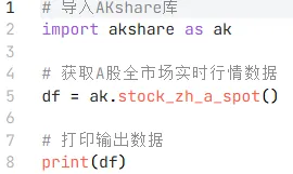 这个接口会直接返回一个 Pandas DataFrame 格式的数据集,包含股票代码、名称、最新价、涨跌额、涨跌幅、今开、昨收、买入卖出价、成交量等全维度实时指标,一次性拿到全市场数据,做标的筛选、行情复盘超方便。