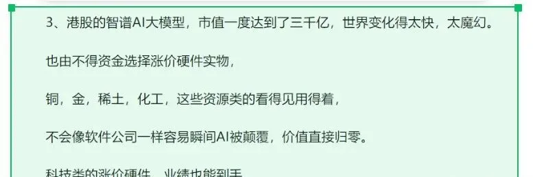在下一个连板龙打出赚钱效应之前,重心还是要在趋势上。2、今天涨价继续嗨,如昨天所写,资金倾向于实物资产,AI应用今年估计会有一个爆发,已经在不断的颠覆一些原有的东西和行业了。1、汉缆股份,4B,电网换手龙,这里短线可能会模仿这种赚钱效应,没有突破监管的妖股出来前。5、江钨装备,2B,昨天留言区的老师提的,牛逼,短线加速,4个板了,不过感觉加速不是好事,板块说不定又快调整了。6、航天发展,首板,商业航天,都埋得没脾气了,我早上看到都没敢追。8、北方稀土,,首板,稀土,涨价线。盛和资源居然没跑赢。AI应用的基础还是 芯片制造,台积电还在扩产建产线,国内的先进制程也会跟着水涨船高。龙芯中科,燕东微,珂玛科技,新莱应材,南大光电,扬杰科技自己挑吧。另外deepseek 还没有更新,难道是在憋一个大的?deepseek这波降本的原因之一,好像就是因为架构引用了部分国产CPU易中天 对 胜宏科技