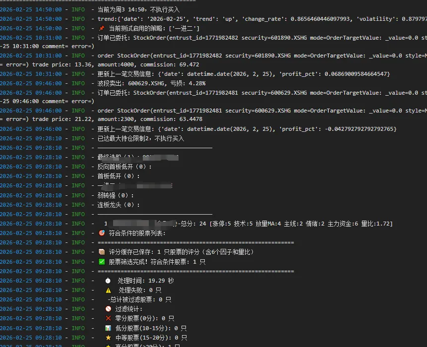 今天市场在趋势中选择了涨价线没有选择科技,说明资金被科技伤得有点多了,但是上午是涨价线普涨轮动,下午分歧后资金回流了最强的磷化工,那么后面分歧主要就看磷化工的板块核心了。明天正常分歧预期,除了磷化工前排,各个分支的核心反包也是有一定套利价值的,这里指数放量冲高回落后形成短期压力位,不过也没有大的回调预期,这里还是震荡为主,分歧中找机会,不要盲目追高。虽然成交量有所放大,但是整体上只能说承接好一些,但是要说多好的行情,算不上。很明显还是量化行情,早上一堆拉升,把该拉的不该拉的都拉板,完全不管下午是否发酵,结果就是,早上涨得最好的涨价线,下午基本没啥发酵了,是不是和年前很相似?板块爆发,结果就给半日游。下午涨价线发酵不动,资金一看,机会来了,开始修复ai应用、机器人、拉航天,航天这边还是有点抱团的意思,资金第一时间都跑航天发展了,结果航天发展涨停,东方财富就开始砸盘,指数开始跳水。这里航天自从主升结束,就一直被打压,一旦有点板块效应,就是砸指数,不过航天下午回落的幅度不算大,明天主要看的就是航天是否超预期竞价,还是说竞价继续指引涨价线。要注意的是指数回落就回落,为了保持住积极的形态,是有拉尾盘的,这里能站稳4141上个波段的高点,证明指数还有上攻的预期,但是拉尾盘,按照纪律,明天就得高举高打,否则竞价不及预期,要小心资金砸盘。而游资超短情绪方向依然打地鼠行情,节前较强的国产算力ai应用机器人连杀俩日,昨日量化反人性轮动拉升超跌太空光伏,白银黄金,电力,今日国产一日游,又反手轮动拉升前面超跌的商业航天,打地鼠隔日套利都没啥持续性。二、模式内交易计划1、昨天晚上复盘感觉全是涨价线没有买点,所以今天就不是很想追化工。2、早上看了一下盘面,策略开出来一个信号小买了一些。三、个人操作记录