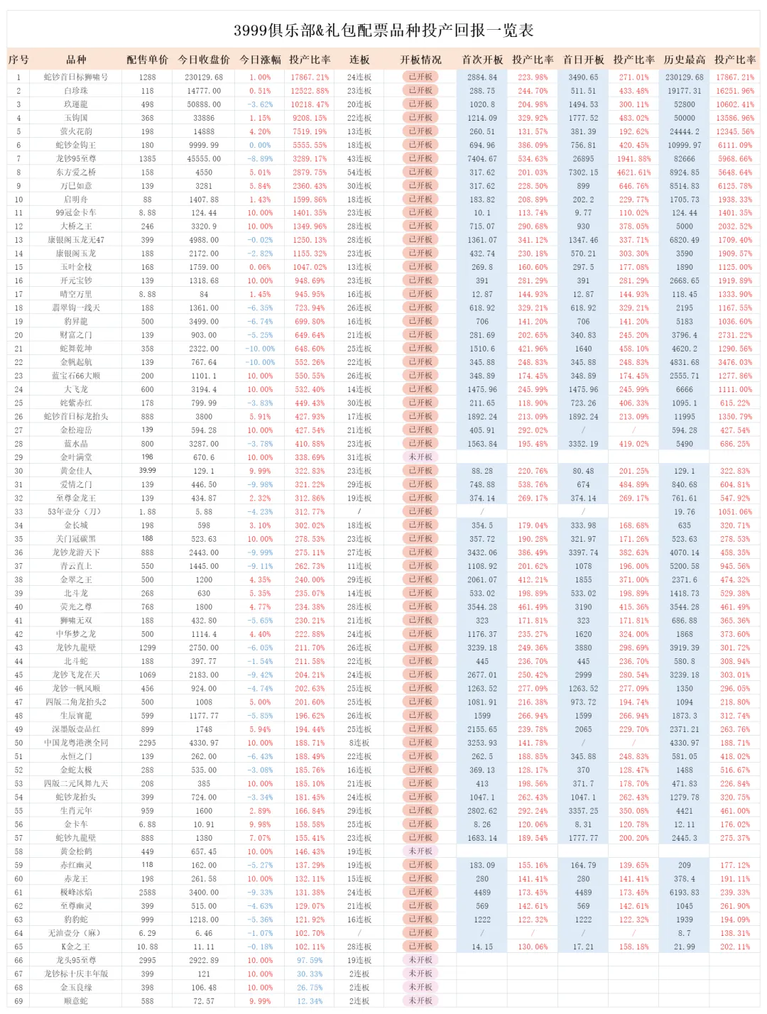 2.25日收盘价已更新。《3999俱乐部&礼包配票品种投产回报一览表》大家可以自行查看。