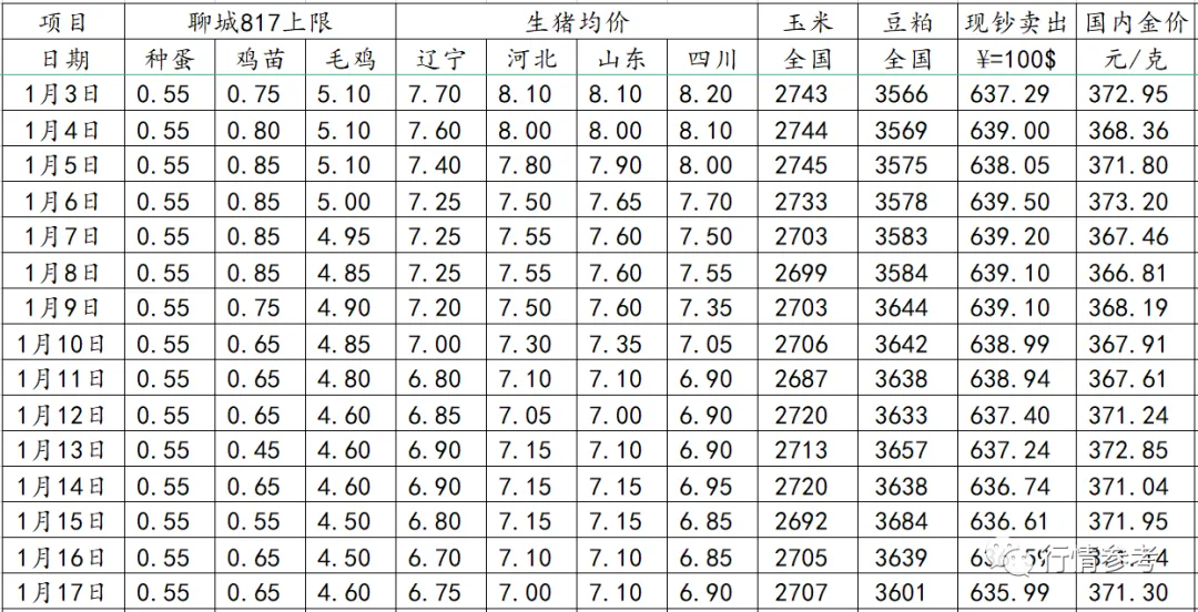 4、据中国禽业分会披露数据,2022年第1周(2022年1月03日-2022年1月9日) 父母代鸡苗价格35.73元/套,周环比涨3.75%,同比涨85.39%;父母代鸡苗销量121.19万套,周环比涨5.50%,同比涨25.25%;在产祖代种鸡存栏106.51万套,周环比跌1.88%,同比跌2.88%;后备祖代种鸡存栏69.96万套,周环比涨5.91%,同比涨43.48%;在产父母代种鸡存栏1607.94万套,周环比涨1.35%,同比跌8.89%;后备父母代种鸡存栏1249.57万套,周环比跌0.55%,同比涨27.22%。本周五,白羽肉鸡7.99元/公斤,周环比涨0.38%,同比跌5.89%。