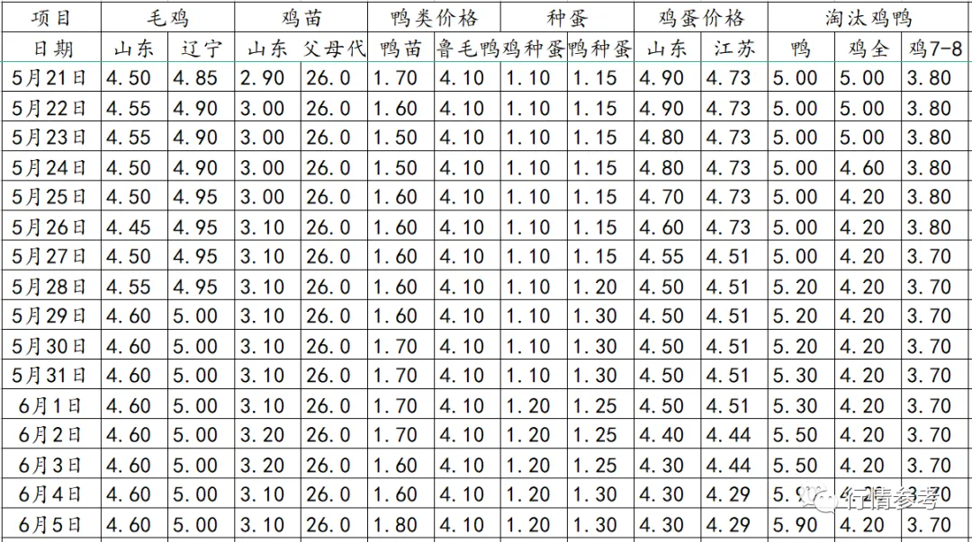 3、肉鸭数据:明日种蛋报价1.25-1.30元/枚;北方鸭苗报价1.75-1.8元/羽。根据数据推算6月上旬进厂的合同鸭成本在4.20-4.25元/斤,总体价格水平比上周回收价格继续上升态势。按最近分割冻品价格测算,目前冻品价格水平保3.90-3.95元/斤区间上下水平的毛鸭价格。基于合同鸭均价理论测算,当期宰杀厂维持在非常明显的亏损状态。未来6月毛鸭合同价格都在4.20-4.30元/斤区间。近日分割冻品主要的主产品(腿类、半片、胸肉类)基本继续维持稳中运行态势。副产类部分单品部分规格运行继续偏弱,针对如鸭头(8/9)、鸭掌L、鸭脖(5/6)、鸭二节翅L/M、单冻全翅、鸭翅根L/M、鸭锁骨等单品不少厂家批量性发货仍继续保持有优惠折让调整动作。