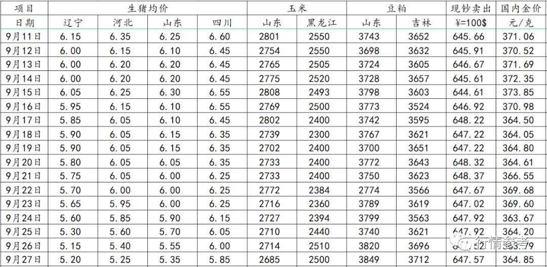 2、玉米:本周国内主产区受持续降雨天气影响新玉米上市节奏放缓,低价也使贸易商出货积极性降低,陈玉米流通量也减少,导致加工企业到货量下降,收购价格出现逐步止跌迹象,截至本周玉米现货均价2622.23元/吨,周度环比跌幅为1.85。9月份中国陈玉米库存继续下降,需求继续增长。华北、华东、华中及西南地区春玉米上市量继续增加,东北地区夏玉米采收时间比往年提前。饲用小麦、稻谷及进口大麦及高粱等替代产品供应充足,拍卖进口玉米继续补充需方库存,总体上9月份大多数时候玉米供需继续趋于宽松。预计9月份大多数时候玉米价格震荡走跌为主,月度均价环比继续下跌。