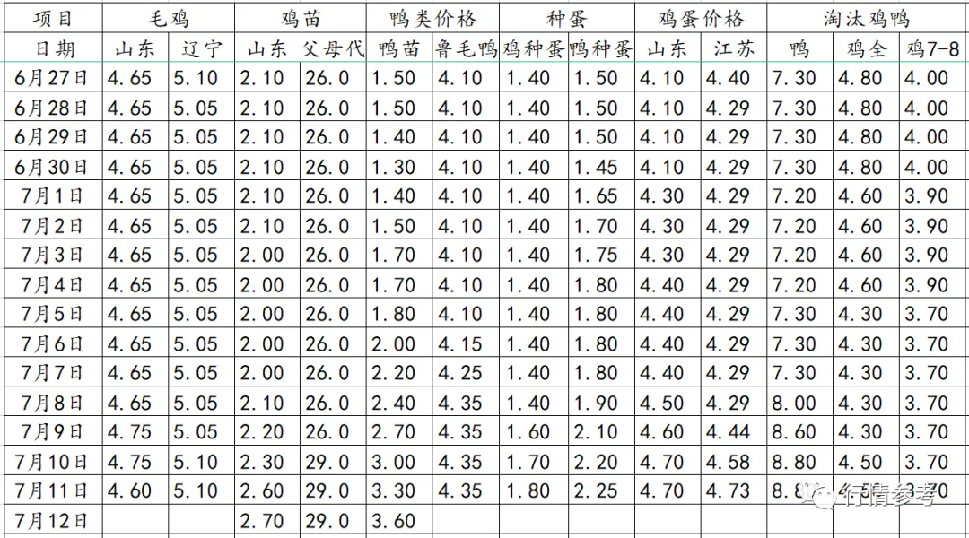 3、肉鸭数据:种蛋报价2.00-2.05元/枚。北方鸭苗3.00-3.17元/羽。根据数据推算7/14-7/20期间进厂的合同鸭价格在4.30-4.35元/斤区间,总体价格水平与前7天报价水平继续明显上升。按今天最新的分割冻品价格测算,目前冻品价格水平保4.20-4.25元/斤的毛鸭价格。基于合同鸭均价理论测算,屠宰环节当期仍处于亏损状态,今天样本监测点厂家分割冻品主要的主产品(腿类、半片)大部分报价较为稳定,胸肉类涨势仍较为明显,报价普遍上调100-200元/T左右,边腿类报价稳定在6600-6800元/T;副产类整体报价整体继续上调格局,头类、鸭翅根L/M、鸭锁骨、鸭掌类、鸭胗类等报价上涨继续比较明显,大部分调整幅度在100-200元/T。屠宰经营压力持续增加,猪肉大幅上行,局部社会库存低位,连续上调氛围加剧了市场的焦躁,补货情绪好转,部分经销商库存充实之后,对当前终端走货节奏和速度表现仍有顾虑,消费基本面处于恢复格局中,屠宰库存下降,鸭苗持续大涨,合同投放成本不断攀新高,冻品推涨情绪继续较强。