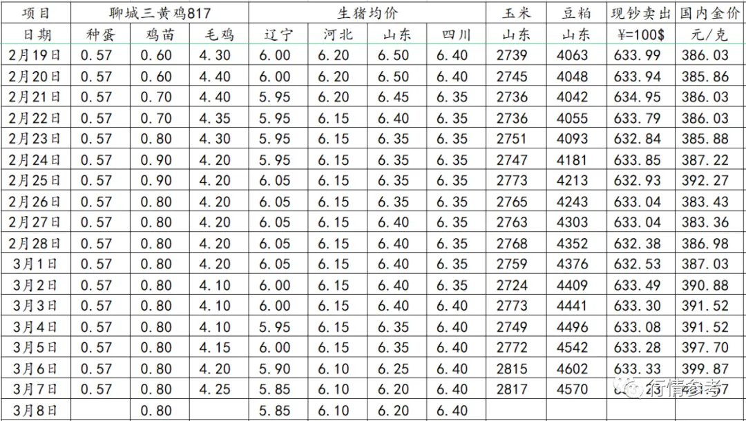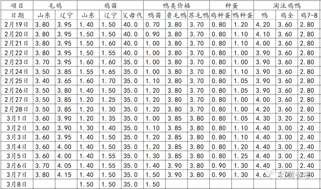 3、肉鸭数据:明天北方鸭苗报价1.50-1.55元/羽;种蛋报价继续上涨0.05,报价1.20-1.30元/枚。当前屠宰厂对毛鸭投放的成本控制还是比较严格,3月2日行业龙头企业发布通知要求严控合同鸭综合投放成本不得超过3.80元/斤,鸭苗价格限价在0.70-0.80元/羽区间。上下环节博弈对抗情绪加剧,限价令发布后,苗价连续逆势上调。根据数据推算,3月第一周期间出栏毛鸭价格基本仍在3.85元/斤左右,第二周待出栏的进厂的合同鸭价格成本在3.85-3.90元/斤区间,呈现上升趋势。按近日最新的分割冻品价格测算,考虑到鸭毛结算价格的明显下跌,目前保3.79-3.82元/斤上下水平的毛鸭价格,明显低于当前实际进厂的毛鸭价格,屠宰环节进入亏损状态。虽然局部市场走货略有好转,但整体来说走货情况仍一般和趋弱,需求面支撑明显不足;与此同时,毛鸭成本呈现上升趋势,鸭毛结算价格明显下跌,当前屠宰环节当期宰杀综合利润再度形势严峻,基于未来断档期阶段性的产量减少,屠宰抗跌、挺价、推涨情绪也在增强。综合供需两侧情况,短期内行情或区间震荡,上下大幅度的折腾劲都不是很足。
