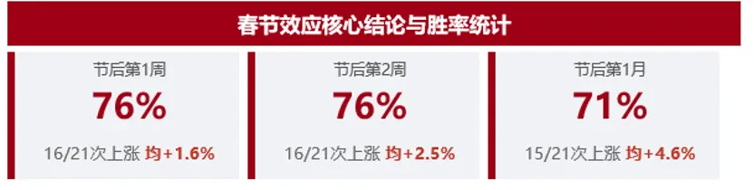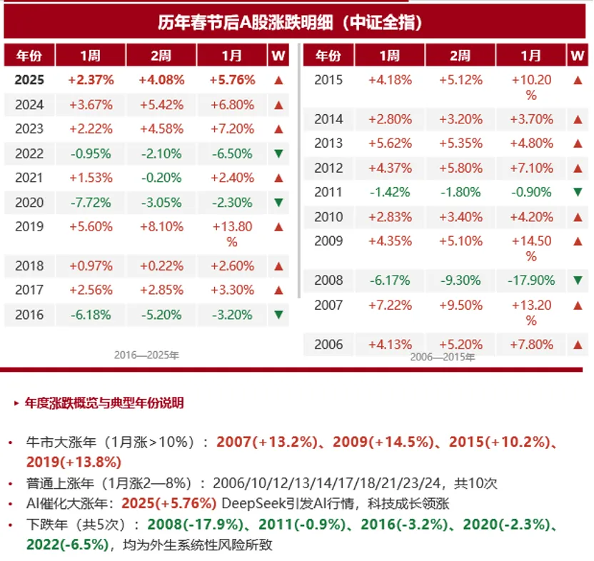 节后红包行情的胜率比较突出:20次春节,节后1周胜率16/21(76%)、2周同为76%,1月胜率71%(15/21),显著高于全年平均约52%。5次下跌均为外生系统性冲击(08金融危机、11通胀紧缩、16熔断、20新冠、22俄乌),非节日效应本身失效。