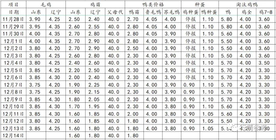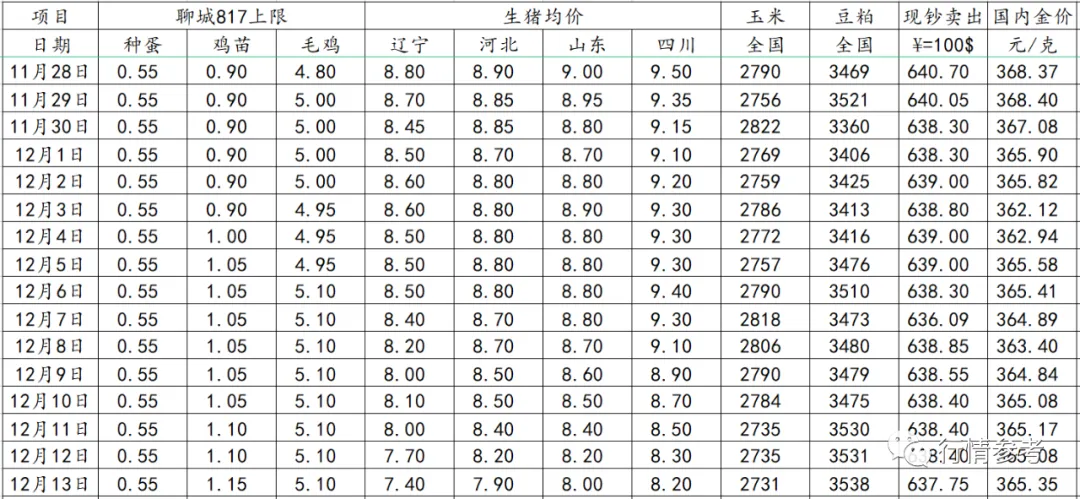 本周鸡苗价直线下降,年前最后一批鸡,以市场鸡苗从下周起陆续进入停苗期,养殖户接雏积极性下降,鸡苗价格以降为主弱势运行。本周毛鸡出栏量稳定,毛鸡价格涨后回落,周初产品市场走货相对稍快,屠宰厂通过提振毛鸡价格拉涨鸡肉产品价格,终端消费拉动无力,鸡肉销售商按需采购,屠宰厂调整产能,毛鸡价格下滑,预计下周毛鸡价格在3.65-3.9元/斤振荡调整。终端消费疲软,鸡肉销售商拿货谨慎,屠宰厂出货速度放缓,库存逐步升高。受供需双重影响下,预计后市产品价格以稳为主或稍有下滑。元旦前行情分析:环比情况来看,虽然社会鸡出栏量减少明显,但合同鸡量总体还是比较平稳和有保证的,毛鸡供给结构上的变化或会驱动阶段性的小行情;但考虑到同比情况,毛鸡绝对值量仍是明显增长的,再结合目前走货和产品需求情况,小行情或有,但出现大行情的概率仍比较小。随供需短时变化,阶段性的涨跌调整肯定是正常会有的,但是大方向和周期趋势还是比较清晰和确定。目前基于终端出货情况,各位还是要保持相对谨慎情绪,战术上抓小行情适度备货,战略上仍要继续谨慎,不要过度乐观,不过也不要“进一步”的悲观,大通胀背景下,各种成本都在上涨,各种消费品涨价也此起彼伏,冻品整体行情绝对值底部还是有一定的成本支撑。