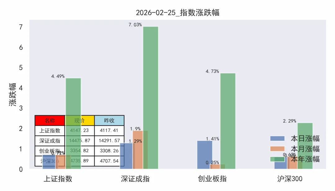 2 月 25 日 A 股延续马年强势,三大指数集体收涨,结构性主线清晰。沪指收4147.23 点,涨 0.72%;深成指涨 1.29%;创业板指涨 1.41%。两市成交额2.47 万亿元,较昨日小幅放量,超 3700 只个股上涨,赚钱效应扩散。板块上,有色、化工、稀土等涨价周期领涨,AI 算力、半导体、光模块同步走强,资金向业绩与硬核赛道集中;节前消费题材继续休整。北向资金回流,主力资金聚焦周期 + 科技双主线,市场震荡上行格局明确。