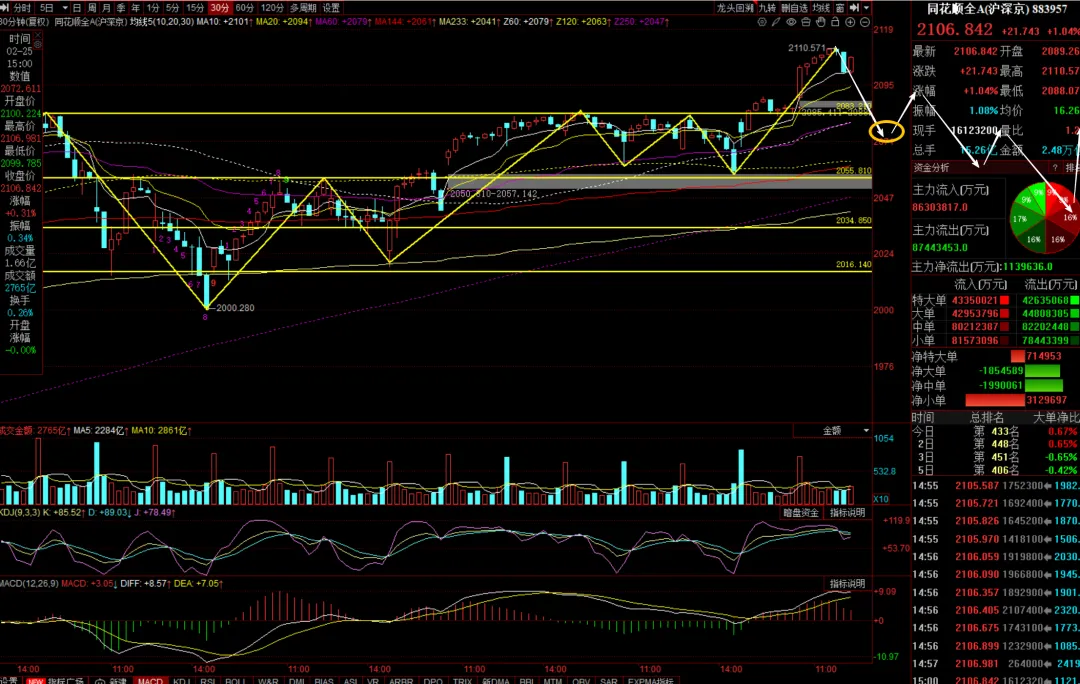 (2)同花顺全A 30分钟强势调整跌破2083,观察5分钟底背离做短线低吸。