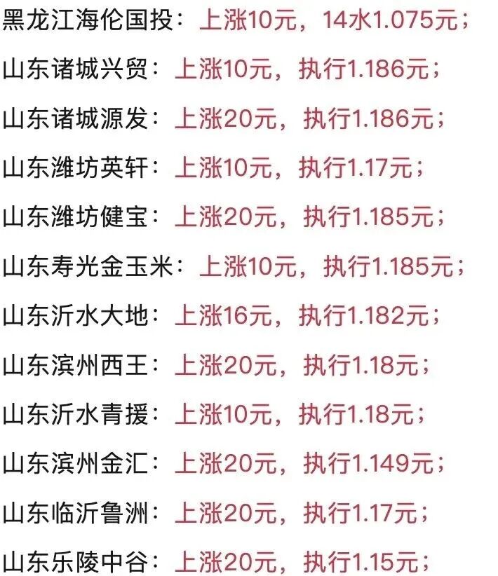 恒仁工贸、滨州金汇、寿光金玉米等十多家企业纷纷上调收购价,涨幅普遍在10-20元/吨,市场一片向好。
