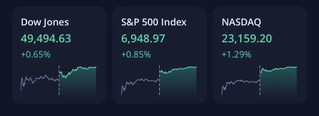 截至收盘,道琼斯工业平均指数上涨约285点,涨幅0.58%,报49459点;标普500指数上涨54点,涨幅0.78%,报6944点;纳斯达克综合指数涨幅更显著,上涨约284点,涨幅1.24%,报23147点。科技板块表现突出,纳斯达克100指数升幅达到1.4%左右,信息技术板块成为标普500中领涨行业。