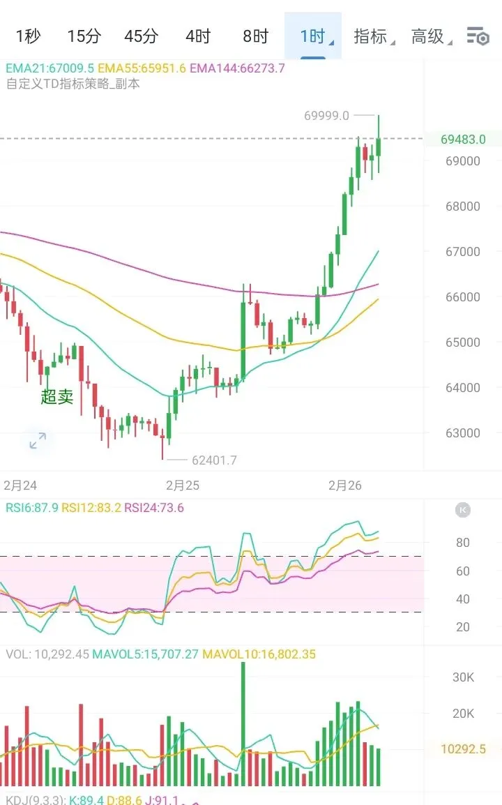 凌晨时刻,大饼与以太携手发动多头反攻,走势强劲。其中,大饼24小时涨幅超过8%,价格最高冲至69999美元一线,随后略有回落,目前交投于69300美元附近。以太坊表现更为突出,24小时涨幅达14%,虽从高点2149美元回调至当前2110美元左右,但整体上已彻底摆脱了此前的震荡区间。