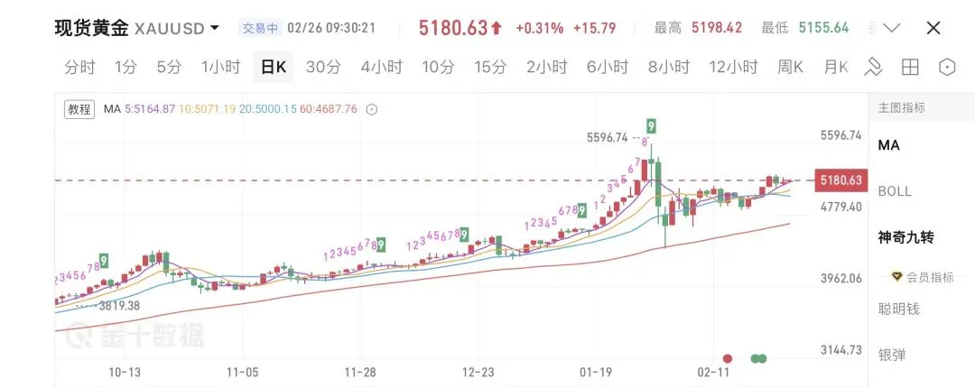 2月26日周四亚洲早盘,现货黄金报5188.5美元/盎司 。然而在昨日美市盘中,金价再次上演“过山车”行情,一度冲高至5217美元上方后突然跳水逾60美元,最终收于5164美元附近 。