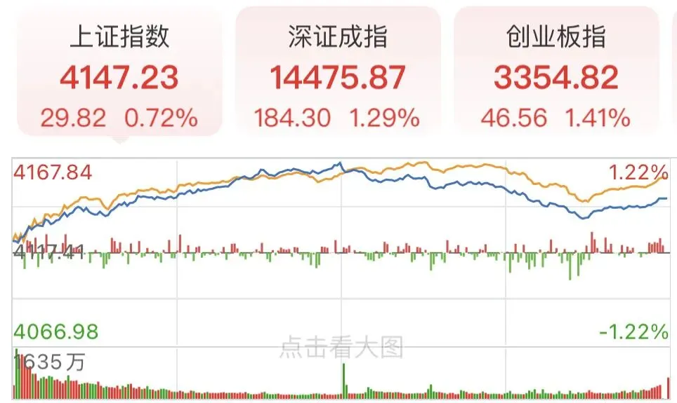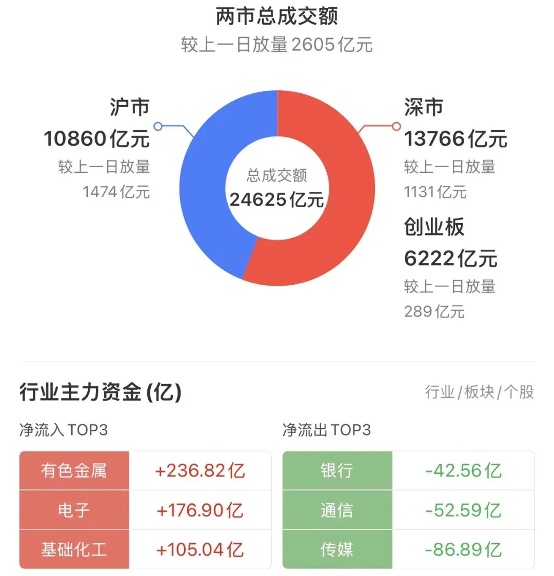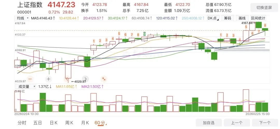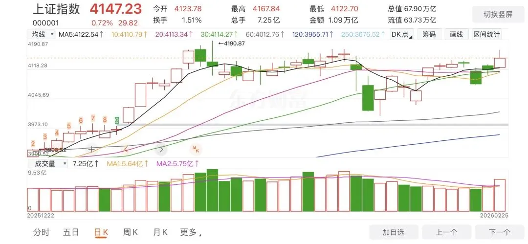 周三,春节后第二个交易日,上证高开高走,午后回落,最终收盘4147.23点,涨0.72%。创业板收盘3354.82点,涨1.41%。个股涨多跌少,3700+家上涨,1600+家下跌。成交额2.46万亿,较前一个交易日放量2605亿,温和放大。今日稀土、有色金属、卫星、新能车、通用航空等板块领涨。1.【COMEX黄金】5183.7美元/盎司,涨0.14%,黄金ETF518880涨0.08%。 【COMEX白银】89.21美元/盎司,涨1.95%。3.全球“AI总龙头”英伟达披露的最新财报显示,2026财年第四财季实现营收681亿美元,同比大幅增长73%,高于分析预期的656.84亿美元。同时,英伟达给出的业绩指引也超出市场预期,大幅缓解了市场对“AI泡沫”的担忧,证明AI产生的需求持续强劲。4.“稳定币第一股”Circle Internet Group, Inc. 最新公布的季度业绩全面超出市场预期,同时其稳定币USDC流通量大增72%,达到753亿美元。Circle在2025年第四季度营收录得7.7亿美元,同比增长77%,高于市场先前预期的7.47亿美元,净利润为1.33亿美元,同比上升了1.29亿美元。上证成交量10860亿,深证成交量13766亿,合计24625亿,较前一个交易日放量2605亿。