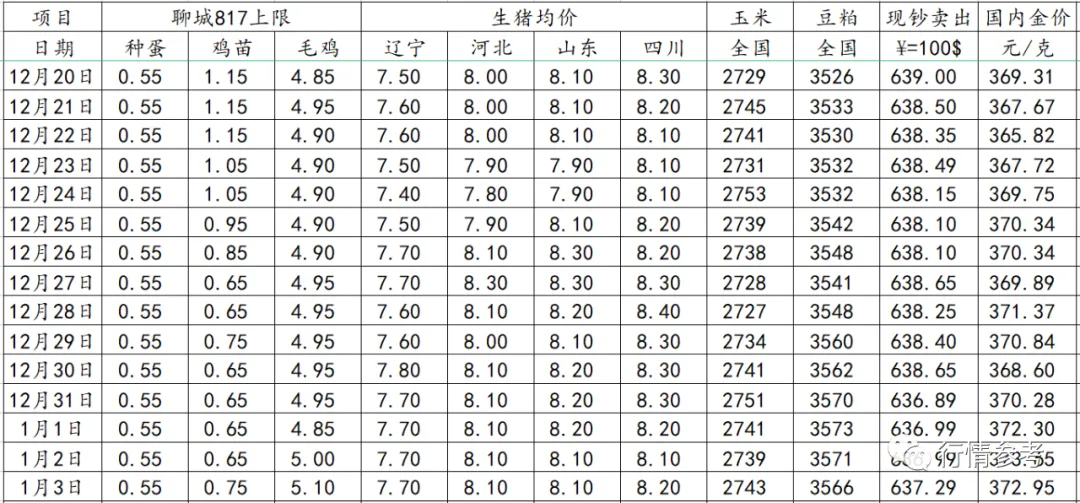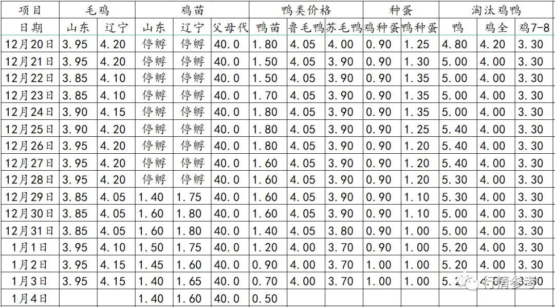 4、本周淘汰蛋鸡价格持续小幅下跌,今日止跌走稳,局部地区有反弹迹象。年底旺季鸡蛋市场并没有如期迎来消费旺季,养殖户对后市行情信心不足,淘汰鸡积极性上涨,终端市场消费需求有限,元旦期间需求或有小幅增长,但有限,淘鸡价格震荡整理或有适度偏强的可能。