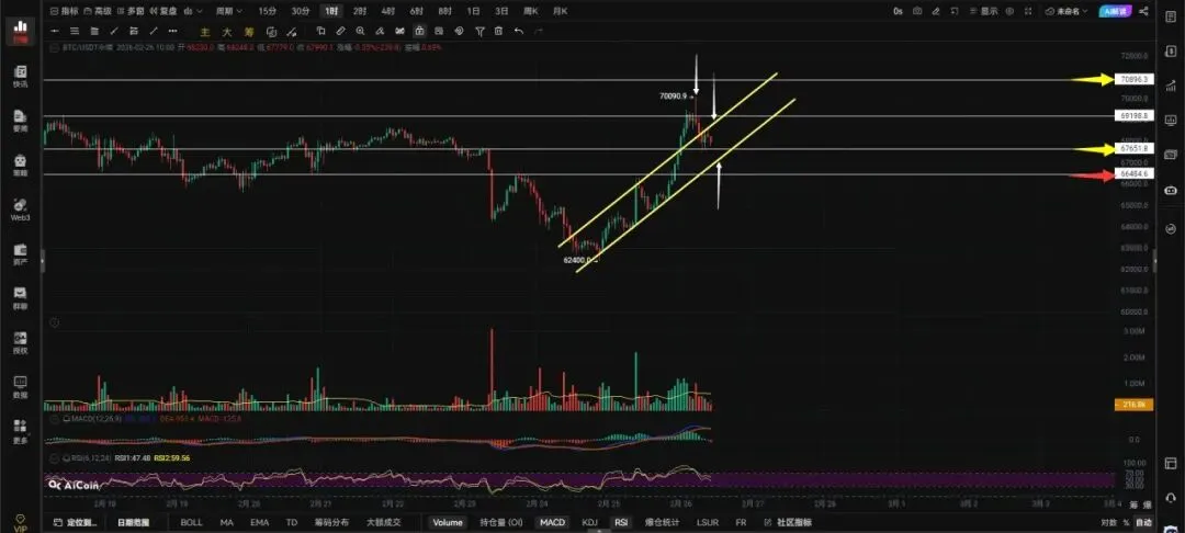 大饼突破了看跌旗形,并且向上插针扎破了7万但是实体收盘价并没有收在7万上方运行,也可以这么理解英伟达财报公布属于利好消息,7万是大饼的阻力,公布利好消息没有突破上方阻力也可以说它是利空,现在就看这波利好消息能持续多久能不能让大饼站稳7万,如果能站稳7万还会延续一波反弹向上看70896和更高的位置。当下的大饼又重新跌回到旗形内部运行,回调不跌破67651的支撑还能向上走一走,跌破67651的支撑就会去回踩旗形下边界和66484的支撑,66484在被跌破那就怎么上来怎么下去,现在66484是大饼的颈线位一旦跌破就会出现更低的低点,那这段反弹就结束了。最好是能维持在67651之上走盘整,破了就废。