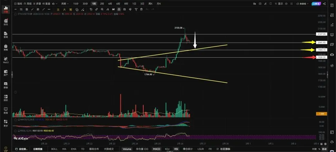 4小时级别跌破2025向下看1961-1922。二饼大喇叭形态被突破,只要回调不跌破2041就不会去回踩喇叭形态上边界,跌破喇叭上边界就要回踩1928,保持在2041上方运行才有继续向上冲的动力,散会。
