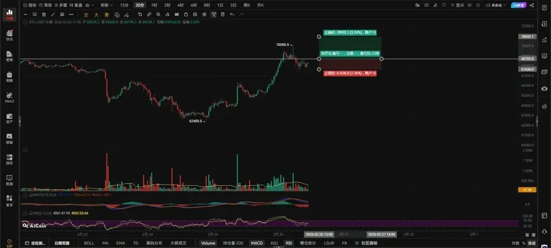 大饼带量突破68705右侧追多激进派上,67751带量跌破反抽无法收回右侧追空,