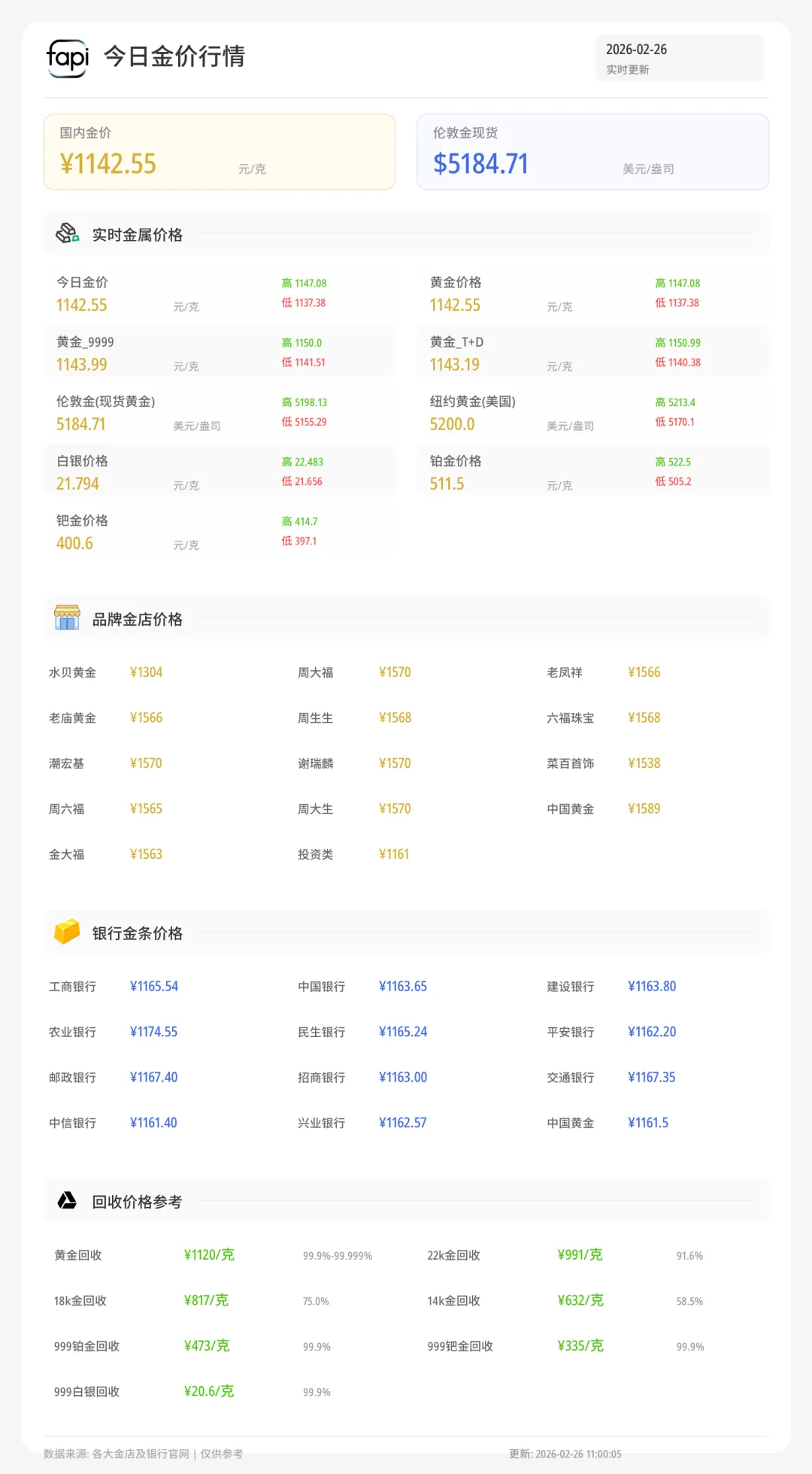 黄金回收今日价格行情:黄金回收实时价格每克1120元,铂金回收价格每克473元,钯金回收价格每克335元,18k金回收价格每克817元,白银回收价格每克21.1元。