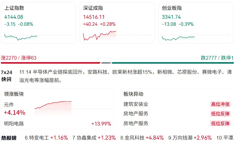 领涨板块:元件等板块涨幅居前,其中元件板块涨跌幅达+4.14%,显示出市场对相关行业的看好。