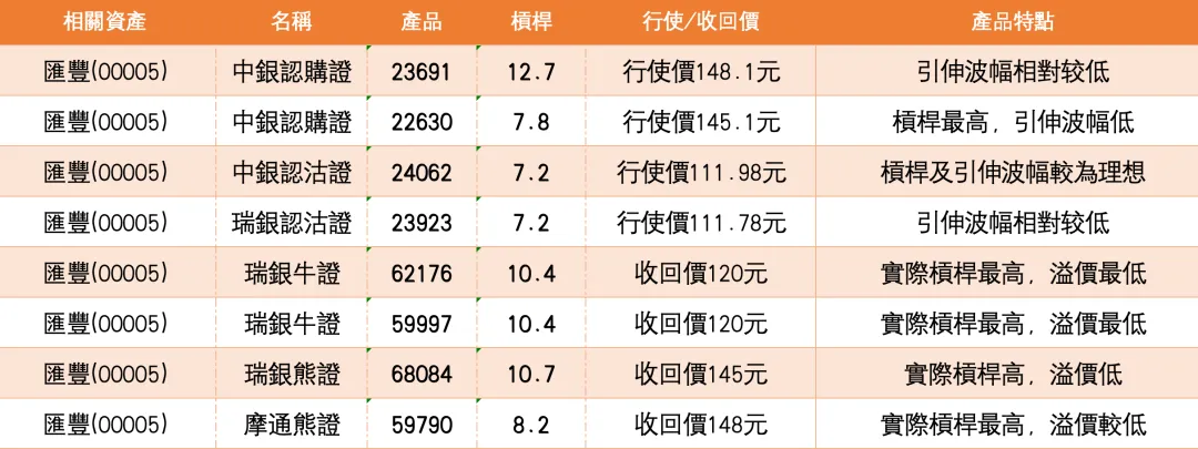 在當前的市況下,投資者可因應自己對後市的看法,從以下產品中作選擇。若看好匯豐控股能站穩支持位並向上突破,可留意認購證或牛證作部署。中銀認購證(23691)提供12.7倍槓桿,行使價設定於148.1元,較現價高出約9.5%,與第二阻力位143.3元相近,屬價外認購證,其引伸波幅相對較低,適合捕捉正股突破阻力後挑戰新高的走勢。另一隻中銀認購證(22630)提供7.8倍槓桿,行使價145.1元,較現價高出約7.3%,其特點是槓桿在同類產品中最高,同時引伸波幅偏低,適合預期股價測試高位阻力區的投資者。