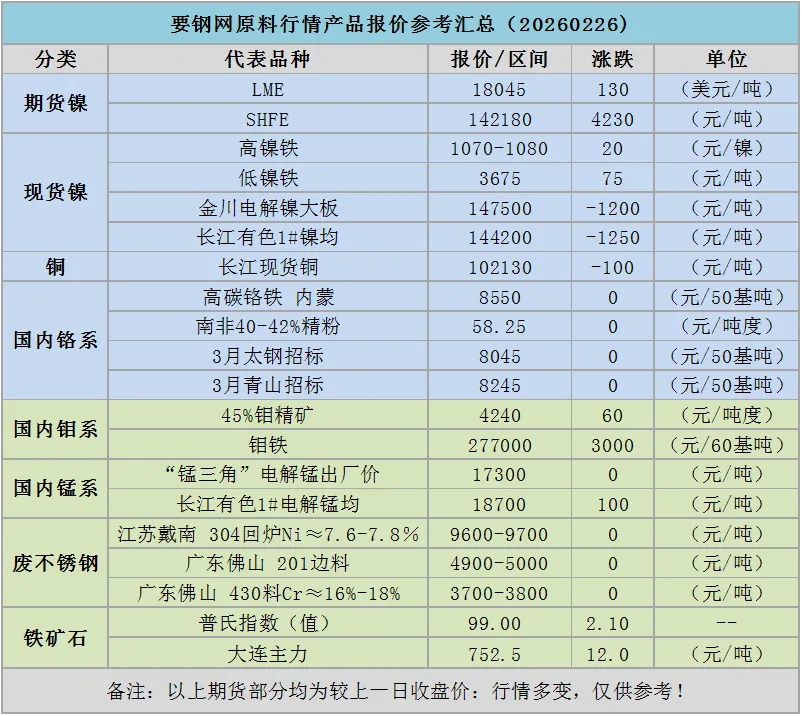 汇总|要钢网原料行情产品报价参考汇总(20260226)
