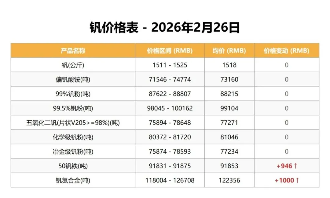 今日钛产品市场整体平稳,所有品类价格均未发生变动。钒产品市场涨跌互现,多数品类价格稳定,但50钒铁和钒氮合金价格显著上涨。钒荣网旨在汇聚钒钛产业链上下游企业,钒荣网将通过资讯浏览推送、“双碳”产业、在线交易推广、技术成果转让、产业金融、钒产业指数、行业标准会议会展、咨询服务数据报告等功能板块,为钒储能上下游企业提供商机对接、行业资讯、产业金融、市场拓展、名企研学、品牌宣传、数据服务、专属顾问等服务。
