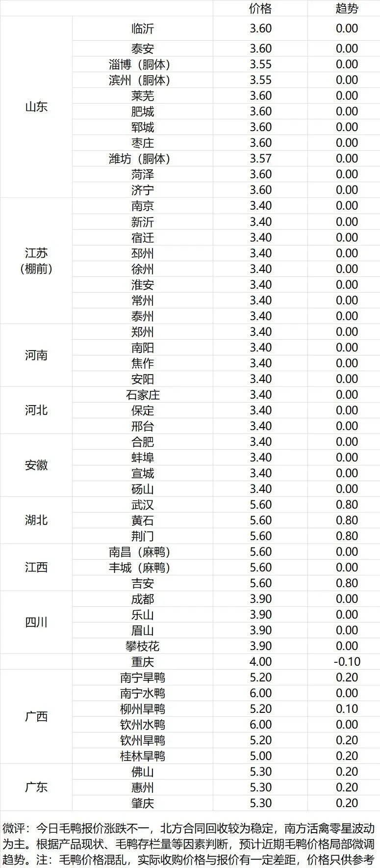 微评:鸭苗报价稳定。(注:南方只报当天价格)市场情绪平衡,整体库存处于阶段性低位,具体成交走势仍有待观察。根据产品、养殖成本及鸭苗现状分析,预计近期鸭苗价格呈稳中微调趋势。种蛋报价稳定。温馨提示:该价格为主流厂家报价,实际销售价格以成交价格为准,价格仅供参考。