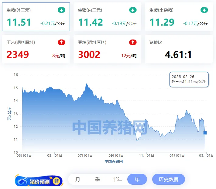 2026年2月26日全国外三元均价11.51元/公斤,今日猪价较昨日报价下跌了0.21元/公斤。