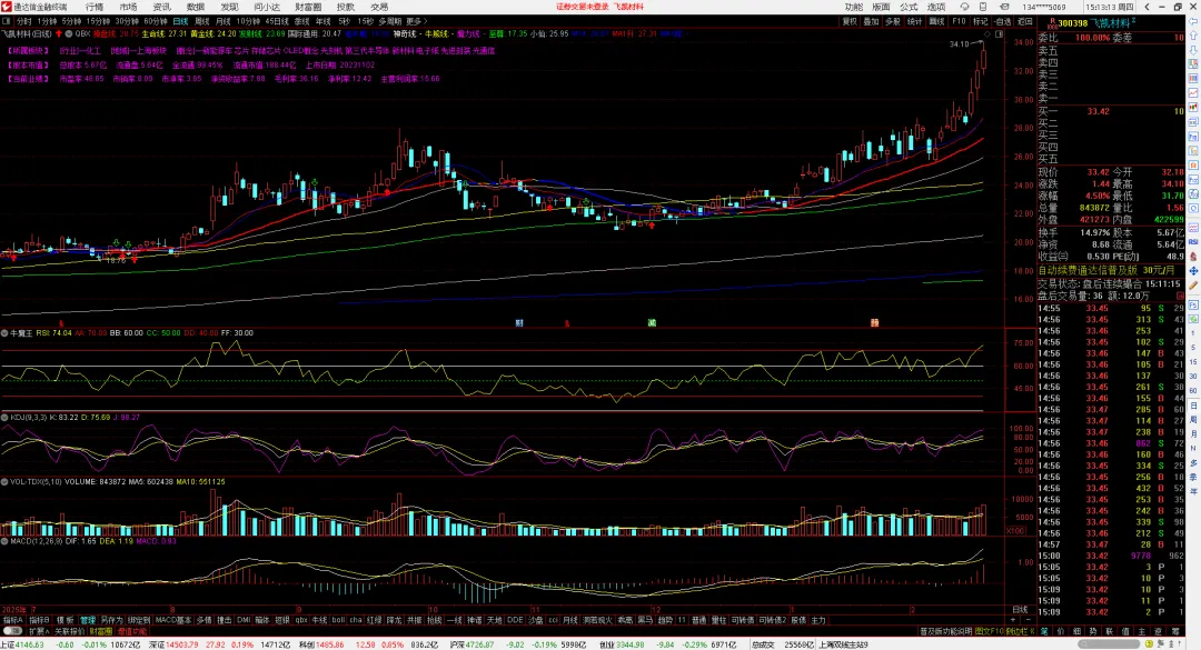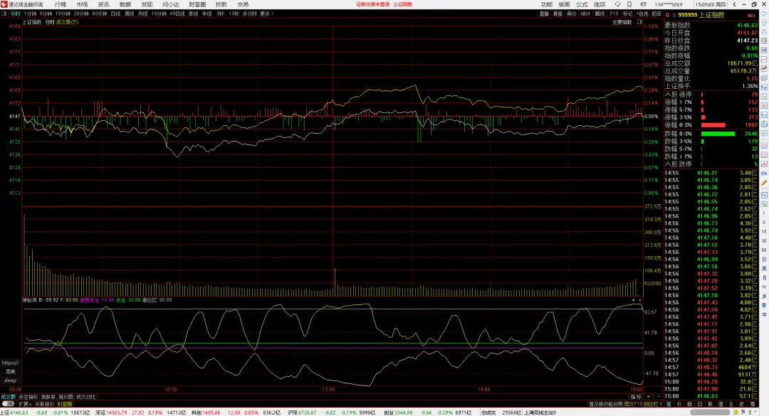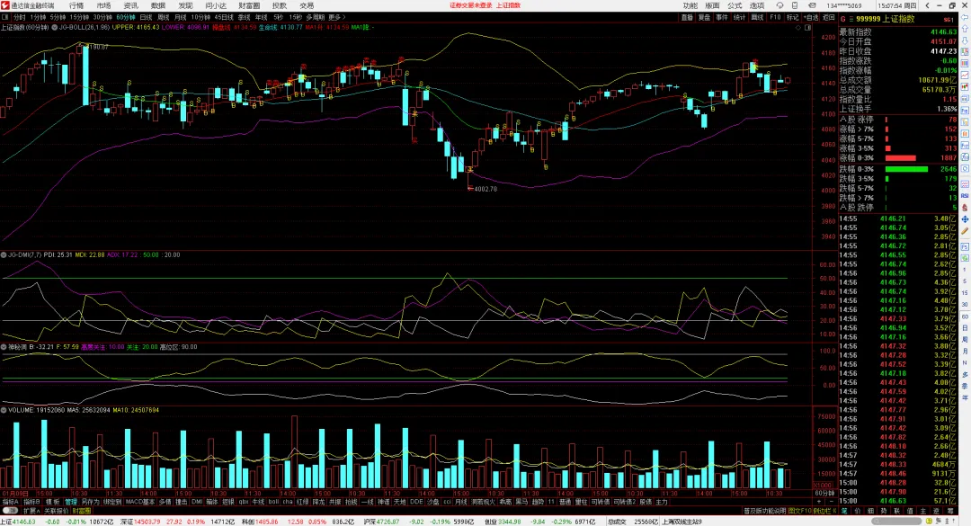 在连续两天的热闹后,今天的指数选择了震荡,周四本来是该跌的,但市场的热情还在,早上比较冷,但是震荡之后,又有人开始做多,昨天火的是钢铁和低价股,今天尾盘又跑到了环保,环保是两会题材,尾盘出现了快速拉升。另外,老科技又回来了,PCB\CPO都是大涨的,最近大涨的是300394,一天涨一天跌,一涨就是10多个点,牛,另外一个PCB大牛300476也是快速拉升。 另外,火的是光通信,关于光通信,在2022年我就提出来了,给大家的品种是002222,昨天的直播中,我又讲了昨天是买点,当然今天涨的不多,也是形态超级好,容易暴发,如果长到五个点就更好看了。 指数分时上,黄线在10点以上就一直在上面,这显示出个股的热情,虽然指数是绿的,但是个股赚钱效应不错,另外60分钟上,指数全在安全区间,日线上也是如此,如果指数能一直保持这样的空间运行就更好了,那才是真正的赚钱行情,指数不跌,个股大涨。这种情形已经10多年未见了。A股三大指数今日涨跌不一,截至收盘,上证指数跌0.01%,深成指涨0.19%,创业板指跌0.29%,北证50指数跌0.15%,沪深京三市成交额25566亿元,较上日放量757亿元,三市超2400只个股上涨。
