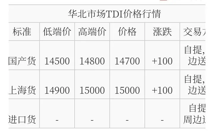 华北TDI国产货报盘价格在14500-14800元/吨,上海货报盘价格在14900-15000元/吨。