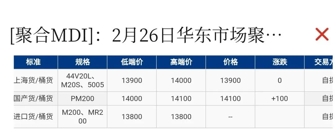 【市场动态】华东区域聚合MDI上海货报盘13900-14000元/吨,国产货源(PM200)报盘14000-14100元/吨,进口货源报盘13800元/吨附近。