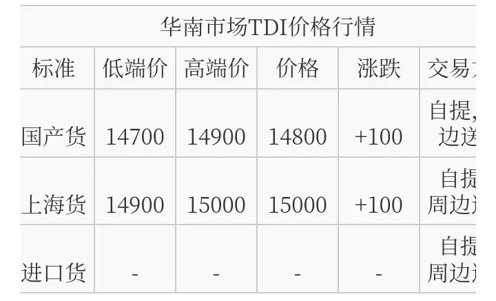 华南TDI国产货报盘价格在14700-14900元/吨,上海货报盘价格在14900-15000元/吨。