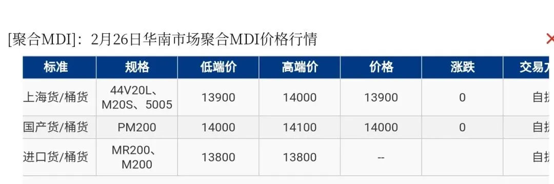 【市场动态】华南区域聚合MDI上海货报盘13900-14000元/吨,进口货源报盘13800元/吨附近,国产货(PM200)报盘14000-14100元/吨。