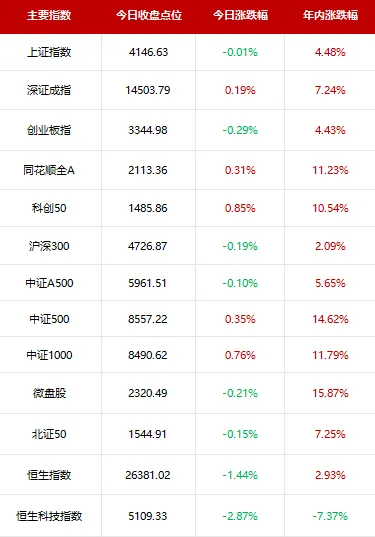 A股三大指数今日震荡为主,截至收盘,上证指数跌0.01%,深成指涨0.19%,创业板指跌0.29%,北证50指数跌0.15%,全市场近2900只个股下跌,成交额25566亿,较上日放量757亿。