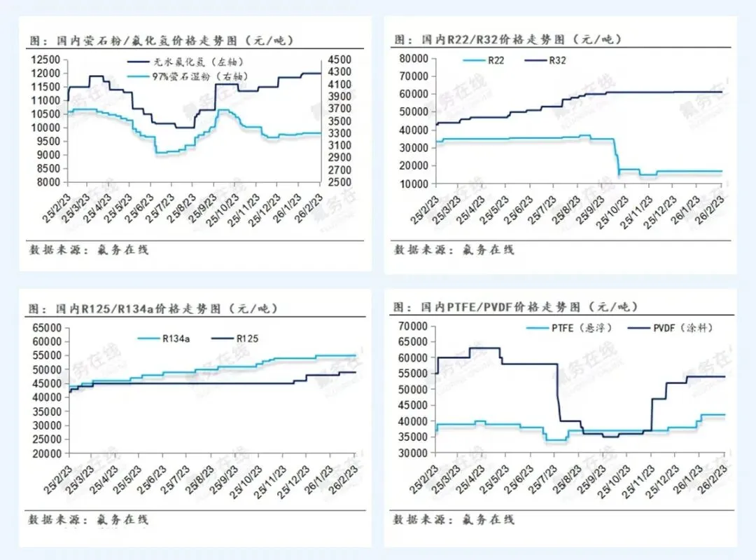 PTFE市场挺价氛围蔓延。受库存紧张及成本不断上升影响,个别企业已发布调涨函,不同产品价格均有上调。由于添加剂成本持续上涨,不少企业装置减产,加之春节前后整体开工率不高,导致市场供应缩减。成本与供应双重压力下,企业持续挺价。目前市场运行平稳,企业根据自身情况灵活报价,整体走势偏强。成本端上行夯实底部,行业供应偏紧、企业库存偏低,叠加节后备货需求,对价格形成支撑。但下游需求无明显变化,采购偏谨慎,可能抑制价格上涨节奏与幅度,预计市场仍有温和上行空间。具体报价:悬浮中粒4.2–4.5万元/吨,悬浮细粉4.5–4.8万元/吨,分散树脂4.5–4.7万元/吨,分散乳液2.8–3.0万元/吨。PVDF市场节后延续挺价态势,但整体波动区间不大。目前供需双方仍处僵持博弈状态:企业生产节奏正常,库存稳定,为价格提供支撑;但下游采购意愿偏弱,多观望节后市场,成交平淡。在此背景下,节前强烈的看涨预期有所减弱,部分小单成交价正逐步向企业报价靠拢,价差呈收敛趋势。分产品来看:涂料级博弈最为明显,报价高企至6.0万元/吨,实际成交多围绕5.4-5.7万元/吨上浮;制品级报价同步上调至5.5-6.0万元/吨区间;锂电级则在储能需求支撑下保持稳中偏强,价格区间维持在5.0–6.0万元/吨。