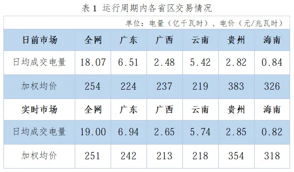 日前市场,广东、广西、云南、贵州、海南日均成交电量分别为6.51、2.48、5.42、2.82、0.84亿千瓦时,加权均价分别为224、237、219、383、326元/兆瓦时。