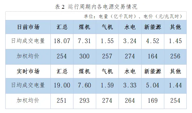 日前市场,煤机、气机、水电、新能源日均成交电量分别为7.31、1.55、3.24、4.52亿千瓦时,加权均价分别为300、257、274、164元/兆瓦时。实时市场,煤机、气机、水电、新能源日均成交电量分别为7.60、1.59、3.33、5.04亿千瓦时,加权均价分别为293、274、264、169元/兆瓦时。