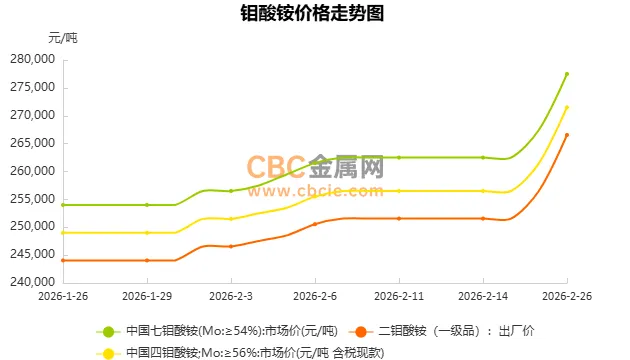 今日中国二钼酸铵出厂含税现款报价上涨,目前在265100~268000元/吨,均价266550元/吨,较昨日上涨10000元/吨。