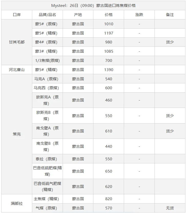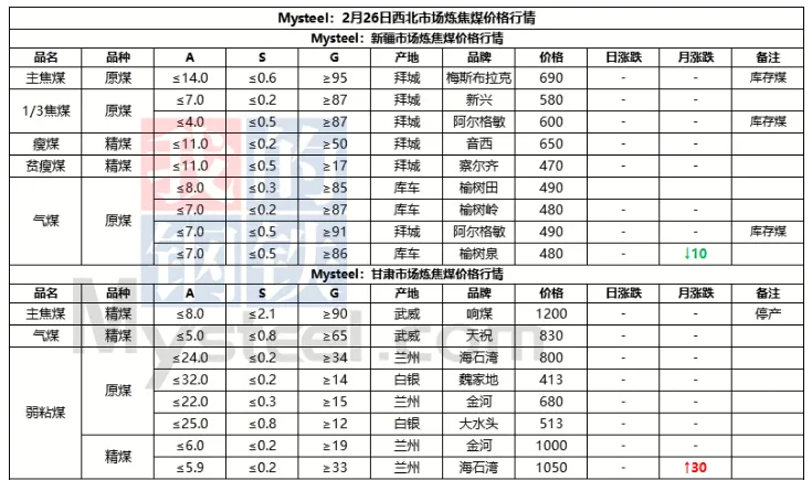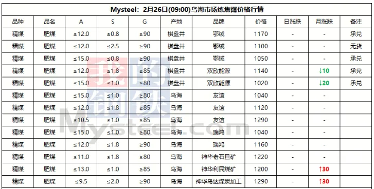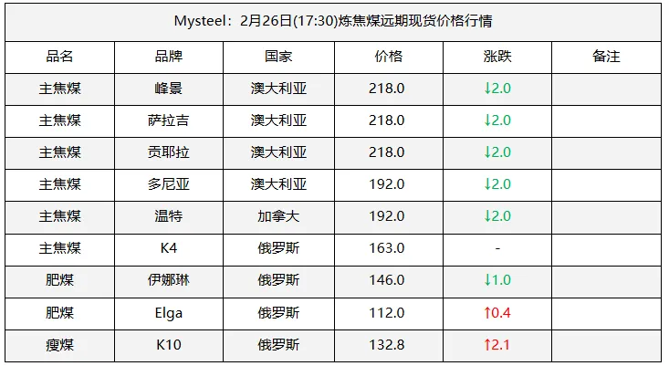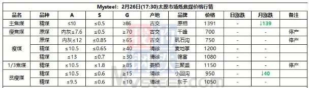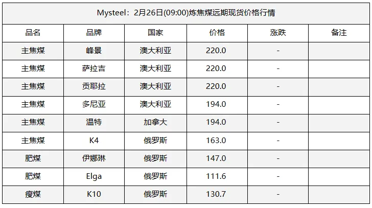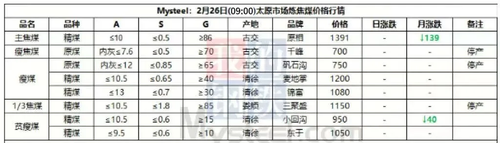 26日太原市场炼焦煤价格暂稳。区域内煤矿陆续恢复生产,产销逐步正常。由于焦企刚刚收假,场内仍有适量库存,目前采购积极性较弱,现货市场成交依旧较为疲软,多数煤矿暂未有新签订单成交,价格暂时以执行年前价格为主。不过由于市场预期较弱,终端未能有明显利好提振,炼焦煤市场短期仍将以弱势下行为主。