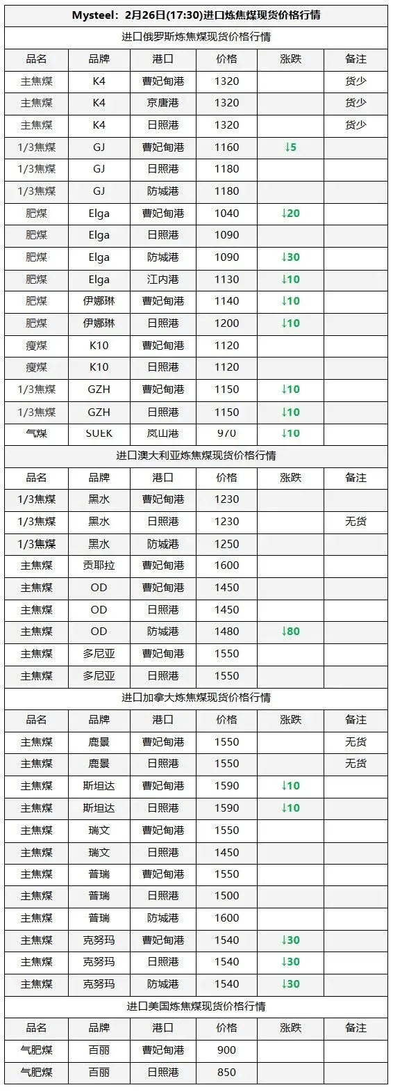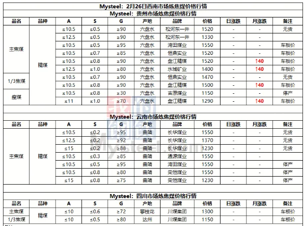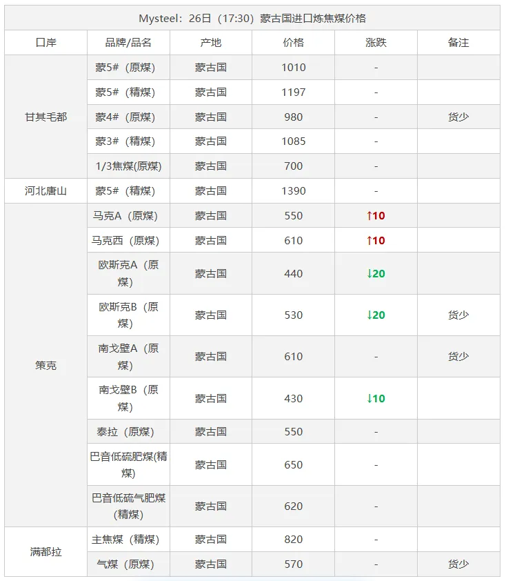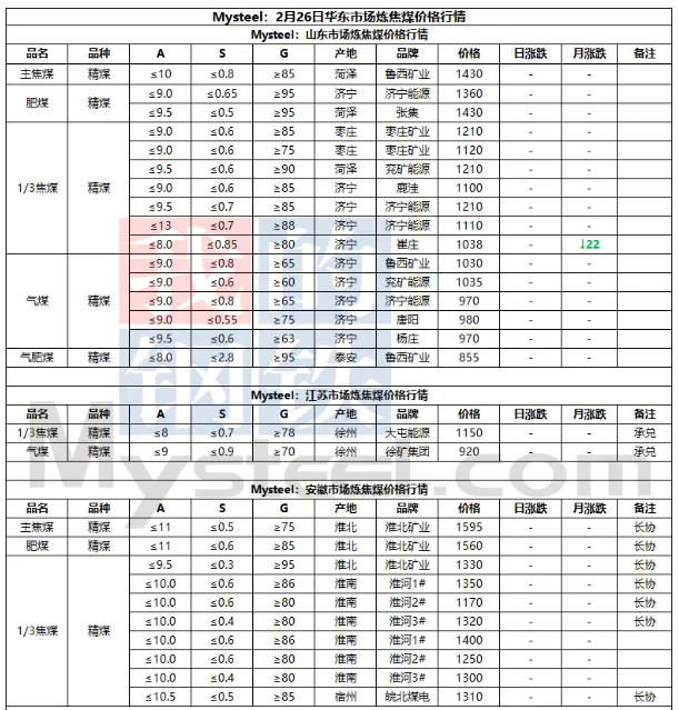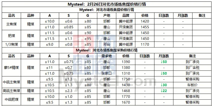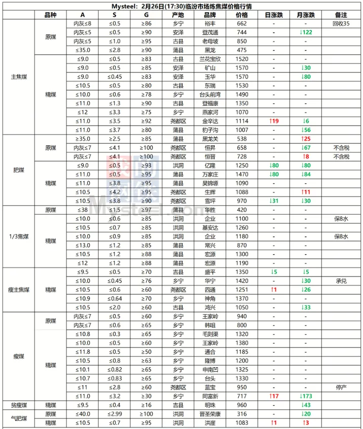 26日临汾市场炼焦煤价格弱稳运行。供应方面,区域内多数国有煤矿基本完成复产,其余民企煤矿近期也将迎来复产高峰期,但也有个别如古县地区复产进度较为缓慢;中间环节,部分洗煤厂近日也陆续安排复工复产,成交量目前较少多以下游刚需补货为主,且价格方面也多处于观望态度,多数价格暂稳节前报价;需求端,当前下游焦钢企业仍以消耗厂内库存为主,原料煤补库需求有限,且近期河北地区部分钢企有高炉检修计划,短期对原料端的需求支撑偏弱。综合来看,预计短期内临汾市场炼焦煤价格将弱稳运行。