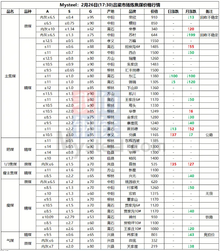 26日吕梁市场炼焦煤弱稳运行。供应方面,区域内多数煤矿逐步复产,个别民营煤矿还在放假停产,焦煤供应陆续恢复。中间洗煤厂及贸易商仍在休假状态,市场成交量偏低,成交氛围清淡。部分煤种价格存在一定下行压力,为促进出货,对个别煤种报价进行小幅调整。今日主流大矿挂拍较多,可关注具体成交情况。需求方面,下游焦化企业虽已陆续恢复生产,但整体开工率提升缓慢,多数焦企仍以消化节前库存为主,采购积极性不高。加之重要会议即将到来,政策压制下,下游企业生产有收缩态势,也将影响原料煤需求释放。综合来看,预计短期吕梁炼焦煤市场稳中偏弱运行。
