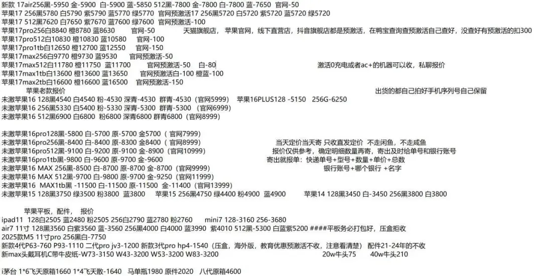 任天堂游戏机: 新款二代NS2港版标配机:3285 新款二代NS2港版马车机:3465,没游戏码:3240(注意下单要看有没有游戏码的 要不然就是便宜的) 新款二代NS2新加坡版 台版 单机:3210,就是没有游戏的 新款二代NS2韩版 欧版 美版 单机:3170,就是没有游戏的 新款二代NS2新加坡版同捆:3440 NS2港版宝可梦同捆:3550 OLED屏 日版白-1985 彩色-2020 OLED屏 港版白-1910 彩色-1970 OLED屏 国行白-1670 彩色-1670 OLED屏 朱紫港版-1970 日版-1970 OLED屏 喷射港版-1970 日版-1970 健身环国行-145 海外版-350 LITE日版 港版 蓝:1035,黑粉1035,绿黄1035 注意区分,这些就不是oled屏的 价格以下(续航版) NS续航国彩-1430 黑-1310,拆封-50 NS港彩续航- 长款- NS续航日彩-1510 黑-1440 长款-30 索尼PS5游戏机 (PS5都要留好纸箱带来,以免破坏品相) 2024新款:PS5 PRO日数:4620 2024新款:PS5 PRO港数:5120 2025新款:PS5 PRO国数:4640 2023新款ps5 日版光驱Slim:3180 2023新款ps5 日版数字Slim:2680 2023新款ps5 国行光驱Slim:老款:2905,新款2925 2023新款ps5 国行数字Slim:2320 2023新款ps5 港版光驱Slim:3210 2023新款ps5 港版数字Slim:2680 PS5国行手柄:黑白410,其他410,外版-20 只收跨境 PSP串流机:1345白,1345黑 PS5单光驱:615,外版575 ROG XBOX : OLED SteamDeck掌机掌上游戏机 512G 美:4000,日港:4000 OLED SteamDeck掌机掌上游戏机 1TB 美:4620,日港:4620 大疆3标准:,全能: 大疆Action4标准:,全能: 大疆ACT5 Pro标准:,全能: 大疆action5pro畅拍: 大疆AC6标准: 大疆AC6畅拍: 大疆NEO标配:,全能: 大疆OM7P:,om7: 大疆 mic1拖1:,1拖2: o4图传: 拍立得MINI12影像花室套装:,外版,一次成像礼盒装 拍立得SE国行:,白色: 拍立得相纸20张:125,10张:62.5 拍立得锡纸装10张:59 任天堂 手柄 NS左右手柄:385 NS2左右手柄:430 NS2 PRO 黑柄:420 PRO国黑柄:305,外版280只收跨境 PRO乱斗柄:320只收跨境 PRO王泪柄:340只收跨境 PRO喷射柄:340只收跨境 PRO异度柄:340只收跨境 2月26 行情参考 大疆pk3标准2575 大疆pk3全能3270 大疆ac4标准1290 大疆ac5标准1900 大疆ac5畅拍2460 大疆ac6标准2750 大疆ac6畅拍3170 影石acepro一代1460 影石acepro2单电黑2250 影石acepro2单电白2300 影石acepro2双电黑2300 影石x5标准黑2770 影石x5全能3300 影石go ultra黑2180白2180 影石aceproPro2 街拍黑 275银 285 影石128内存卡185 影石256内存卡330 影石512内存卡540 遮光罩45黑柔镜30 无忧卡 70 2026年2月26日 华为配件全系列 行情参考 以结算价为准 所有货都不收国补的,一经发现就当送我们的 华为手表系列 华为 Watch FiT4 黑540白530绿555紫535银575 华为 Watch FIT4 pro 黑1150蓝1105绿1185 华为WATCH FIT 2活力款 黑色325粉325 华为WATCH FIT 3 黑430灰525月光白430原野绿445粉430薄荷绿445蓝435珍珠白475 Watch D2 黑 2785白2685蓝2685 Watch D2 药房版 2445 Watch buds 黑1125卡其色 1215 GT4 41m 白 795黑725草木绿00 GT4 46m 黑845棕00绿 00 Watch 4 黑 00褐 00白 00 Watch 4pro 棕 00火星钢00蓝00太空探索 00 Watch 5 46m 黑1845紫2175棕 2270蓝1875钛空银 2645 Watch 5 42m 黑1685白1865杏2255绿1715金2365 非凡2 黑5045蓝6045 非凡手表 黑3445蓝 00绿00 华为新款WATCH GT5系列 GT5 46黑1105蓝930棕910灰910 GT5 41 黑 955蓝895白925青860棕845 GT5pro 黑1195陶瓷2135钛钢色 1425冰川白1025 GT6 pro 黑1775棕2095钢2480 GT6 46m黑 1115灰色 1275绿色 1445 GT6 41m 黑 1030棕色 1445白色 1230紫色1040蓝1040 华为儿童手表系列 儿童4pro蓝495粉495 儿童5pro 蓝760粉750绿755紫755 儿童5X 蓝740粉740 儿童5Xpro 黑1095紫1110 儿童5 绿350紫350蓝415活力蓝350红345 儿童5星耀 粉405蓝420 荣耀手环,华为手环 荣耀手环9标准黑93蓝103紫103 荣耀手环9NFC 黑115蓝115紫115 荣耀手环10标准黑130绿135灰135蓝135 荣耀手环10NFC 黑155灰155绿155蓝150 华为手环系列 华为手环8标准黑103粉105 华为手环8NFC 黑105 华为手环9 黑155白145粉143黄 140蓝145 华为手环9nfc版 黑160白152粉150蓝150黄150 华为手环10标准 黑158粉158 华为手环10铝合金款 黑167白167蓝168紫170向新绿155原野绿150灰155 华为手环10NFC 黑185白193蓝193紫198绿190 B7 黑700灰700 华为耳机系列 华为Free Arc 绿400灰405黑405白385 华为 FreeBuds 7i 白328灰320粉328 华为freebuds6i耳机 白265黑270紫280 华为耳机Free clip2 黑1190白1190蓝1185 华为耳机Free clip 黑色840暖星云925紫 840玫瑰金845 华为耳机FreeBuds 5i 黑218白218蓝217 华为FreeBuds se2 耳机 白72蓝73黑73紫74 华为 FreeBuds se3 黑101金100白100 华为 FreeBuds Se4 白151黑151 FreeBuds 6 白535黑535紫530金530 FreeBuds 4e 2024款 白285银285 FreeBuds pro5 白1070银1075金1075 FreeBuds pro4 黑715绿705白730 华为CD56 pro笔 465 华为CD57 黑290白315 华为CD54S 三代笔291 华为 三代笔充电器 78 Wifi5 黑175白175青173 WiFi3 pro 265 AX3 115 AX6 new 230 AX3 pro new 197 AX3 pro WiFi7 187 BE3pro 千兆版 180 BE3pro 疾风版 167 BE7pro 395 AX2pro 101 Q6 一拖一凌宵版 465 荣耀手表 荣耀手表4pro 黑725棕825绿795 荣耀手表5pro 蓝牙版黑1075灰1075 荣耀手表5pro 插卡版黑1175灰1175 荣耀手表5Ultra黑1215棕1445钛金属1895 荣耀手表5 黑525金525 移动电源 华为22.5w se 移动电源 黑85白90 华为66w 电源 白180蓝190 |
