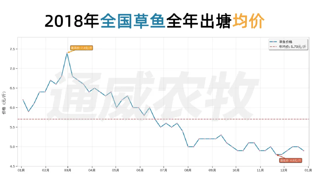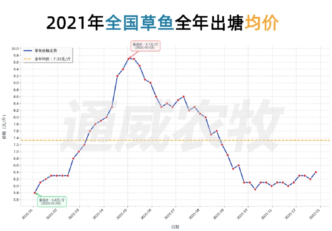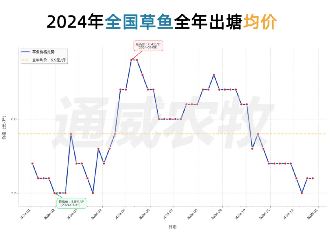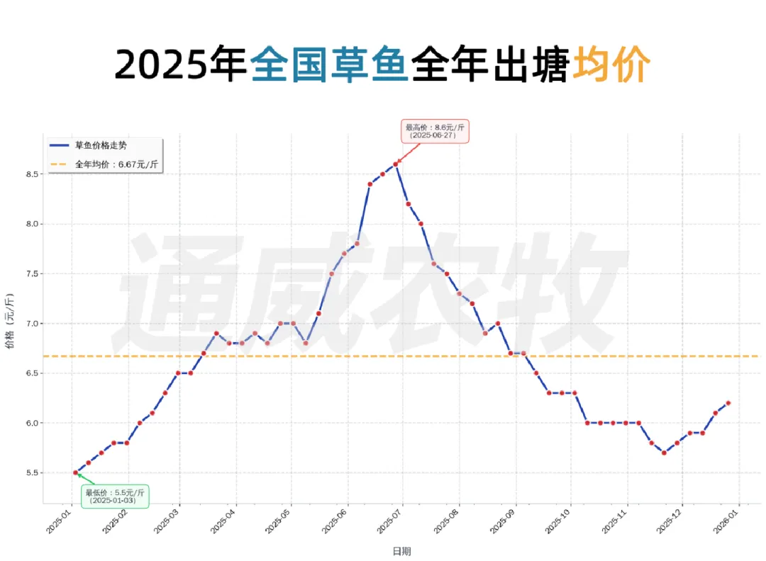 这十年间,草鱼价格从2016年5.50元/斤升至2025年6.67元/斤,波动经历“高-低-高”周期(2016–2021年震荡上行,2021年达历史高位;2022–2023年深度回调;2024–2025年触底回升)。季节规律上,1月多为低价期,5-6月为高价窗口。