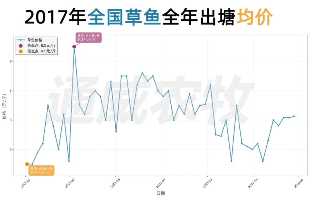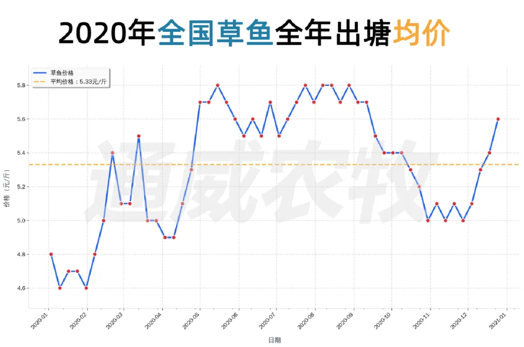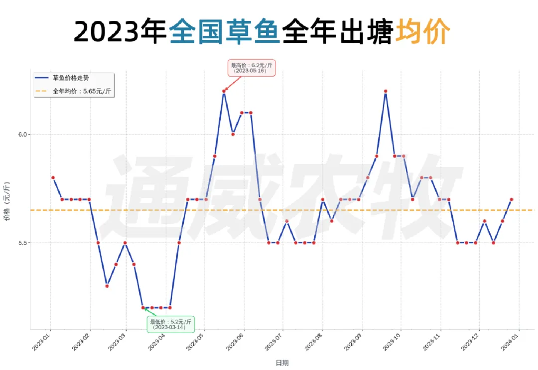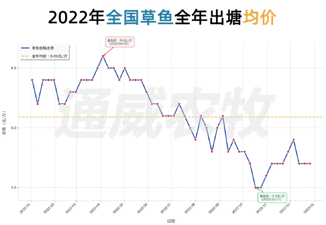 这十年间,草鱼价格从2016年5.50元/斤升至2025年6.67元/斤,波动经历“高-低-高”周期(2016–2021年震荡上行,2021年达历史高位;2022–2023年深度回调;2024–2025年触底回升)。季节规律上,1月多为低价期,5-6月为高价窗口。