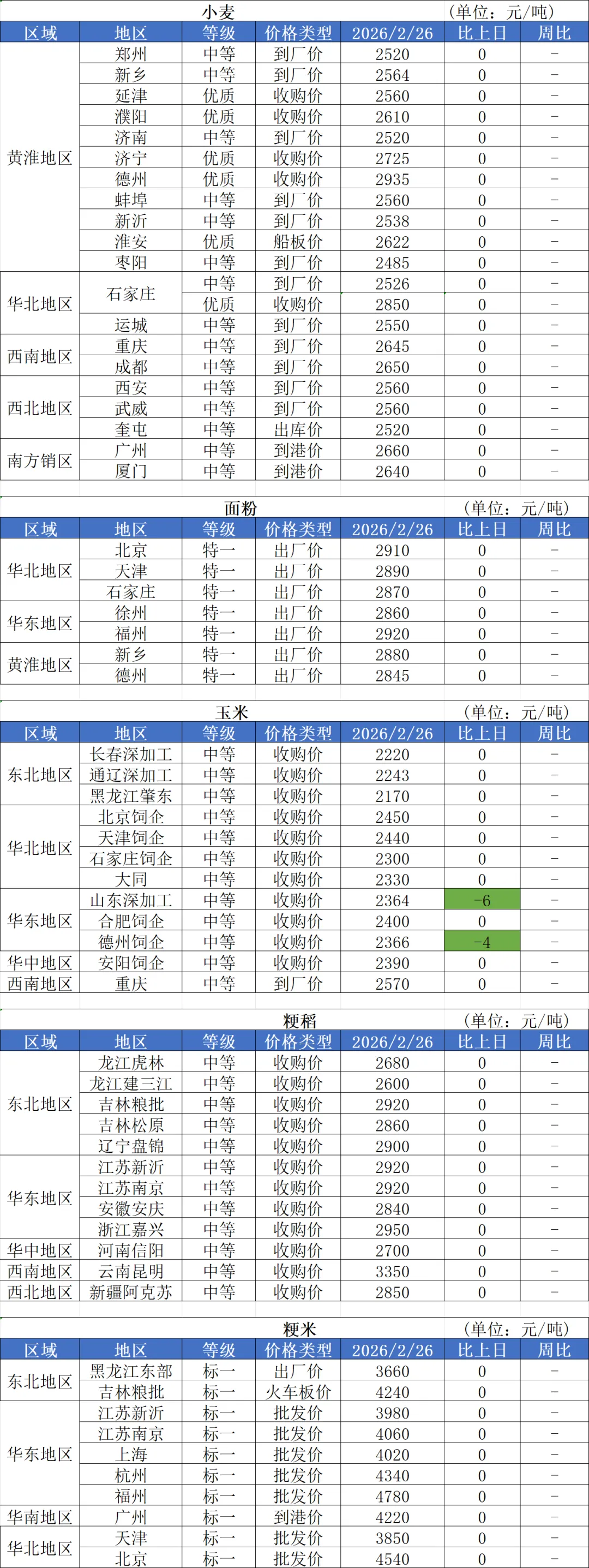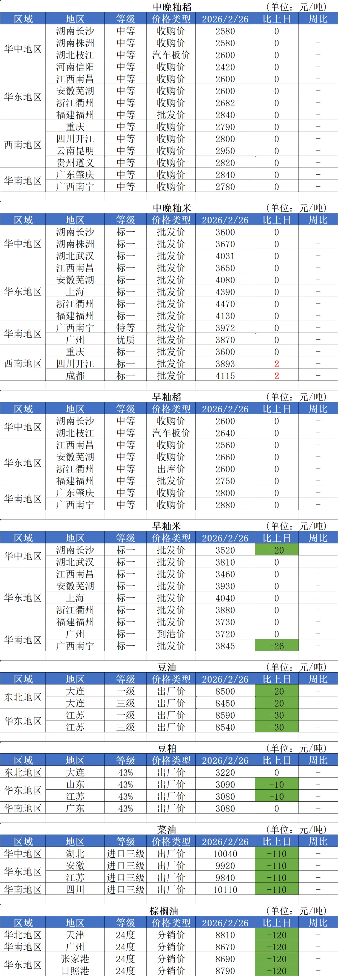 1、节后刚刚复工,不少制粉企业开始缓慢恢复收购工作,但鉴于下游消费结构单一,面粉消费不旺,节后补库需求支撑不足,小麦价格保持平稳运行。2、据国家发展和改革委员会价格监测中心数据,截至2月份第二周,全国生猪均价12.75元/公斤,环比下跌3.26%;饲料平均价格2.66元/公斤,环比下跌0.37%;猪料比4.79,环比下跌3.04%;预计生猪头均亏损134元/头。3、2月26日,主产区中晚稻价格保持平稳。各省粳稻收购均价为:辽宁1.45元/斤、吉林1.53元/斤、黑龙江1.38元/斤、江苏1.43元/斤。4、目前国内油厂大豆、豆粕库存高位,下游备货充足,虽市场传言部分地区海关延长大豆放行时间,但节后进入季节性消费淡季,结合此前较高的买船榨利,在二季度巴西豆的巨量到港及进口豆拍卖预期下,下游将以随采随用策略为主,豆粕现货基差预计仍然承压。5、本周东莞油厂澳洲菜籽开始压榨,该船菜籽通关时间较长。据了解,现共有三船澳洲菜籽到港卸货即将压榨,而产地也将发运第五船菜籽,而2月开始加拿大菜籽也陆续发运,国内菜籽供应将逐步回升。